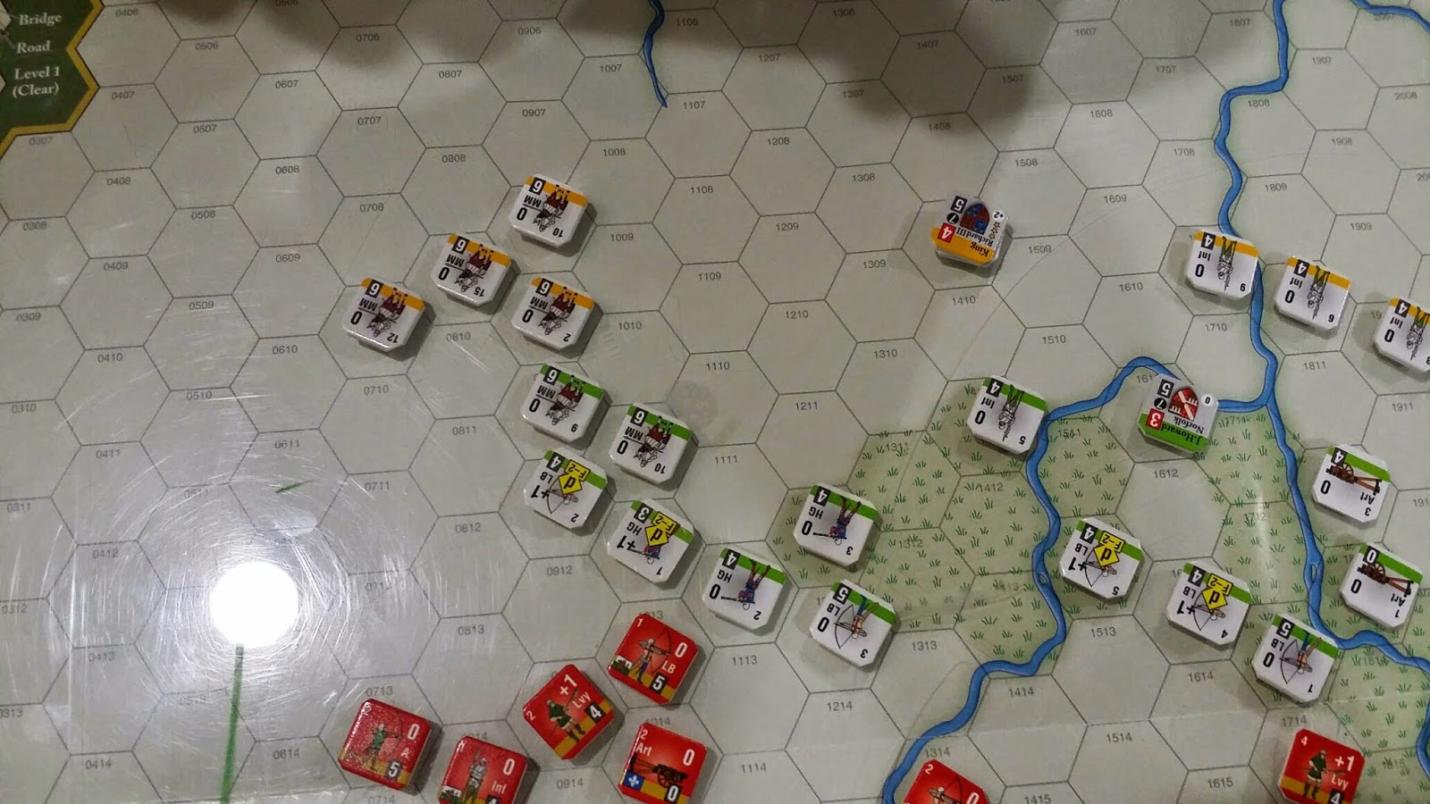 This is the set up. Lancaster forces are the red counters to the SW while the Yorkist forces are the white counters NE facing SW.